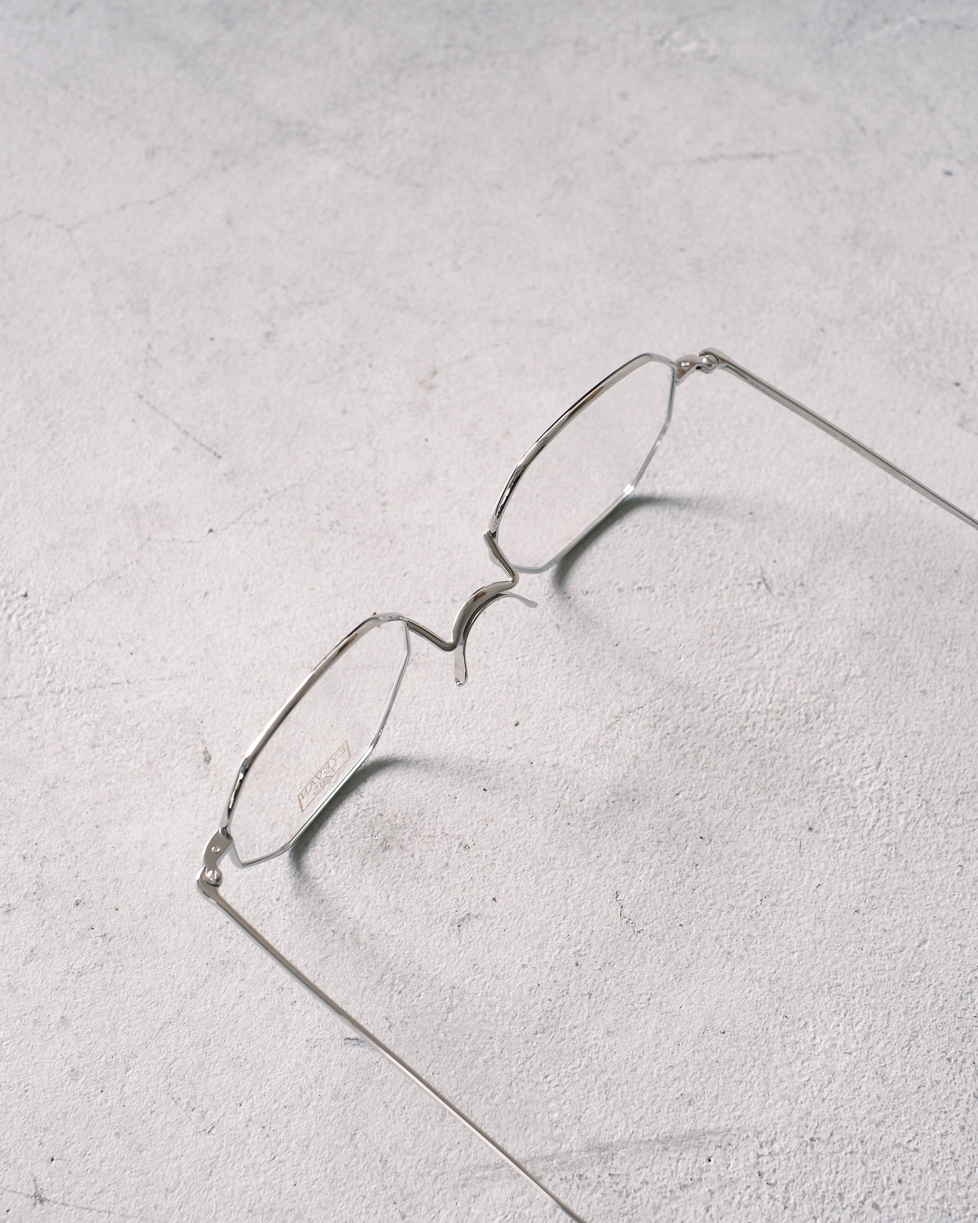 ゆったりサイズの多角形フレーム。ある程度の調整が可能な一山タイプの鼻あてになっているのが特徴的。掛けるとシャープな印象のモデルです。