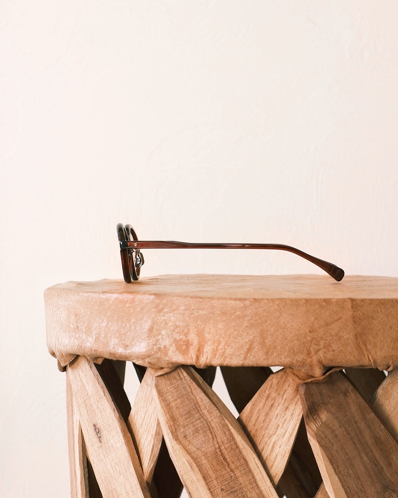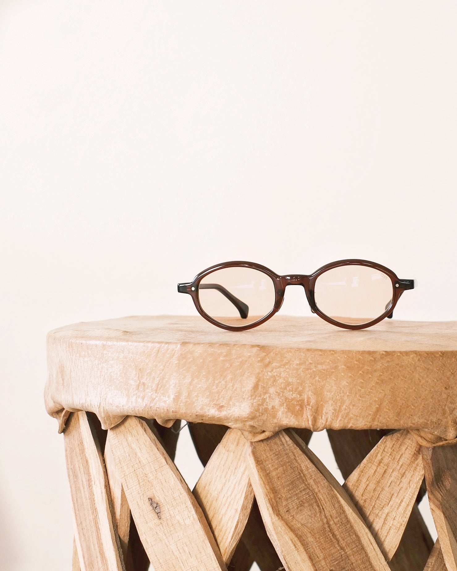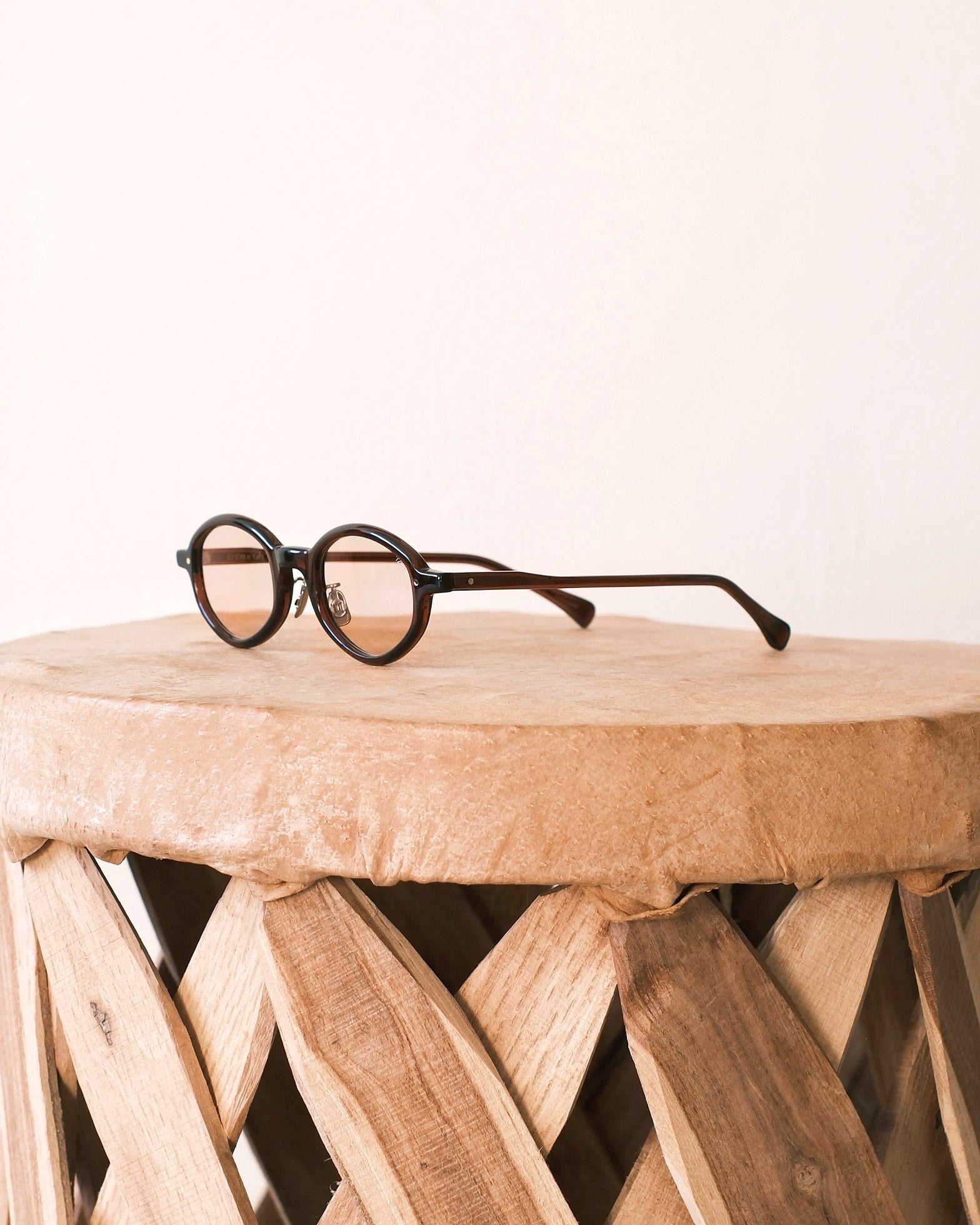 バレル型(樽型)のサングラス。小ぶりで男女問わず掛けやすいサイズ感です。オリジナルサングラスには、メーカーオリジナルのガラスレンズが採用されており、美しい色味とクリアな見え方が特徴的。そこまで濃くないので、室内、夜でもそのまま掛けていられます。